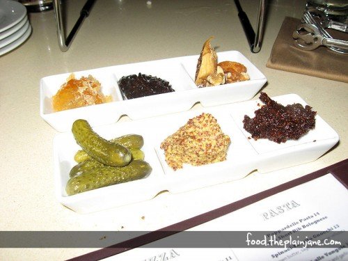 We’ve got some local organic honey, some kind of cherry jam (I forgot what it was exactly), dried fruits and nuts, fig jam, Italian mostarda, and little pickles.