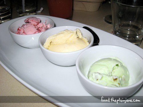 Our waitress started us out with what she called the “Stoplight Gelato Sampler”. We all tasted and tried the strawberry gelato, vanilla gelato and pistachio gelato. Jake was totally in love with the pistachio gelato – and I will admit that was really good. Their gelatos were really smooth and creamy. I liked the fruit pieces in the strawberry, the simply flavor of the vanilla, and the nuts in the pistachio.