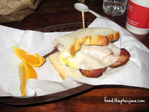 As for me, I got the Morning Sandwich with bacon. It came with scrambled eggs, a slice of provolone cheese and really good bacon. My only disappointment with the sandwich is that I wish the bread had been toasted, but it didn’t occur to me to ask. I thought it was going to come on a roll instead of sliced bread so that’s probably why. The sandwich kind of fell apart while I was eating it, but the basic flavors were all there – it tasted fresh, which is something I always appreciate. I ate those orange slices, too. Yummy.