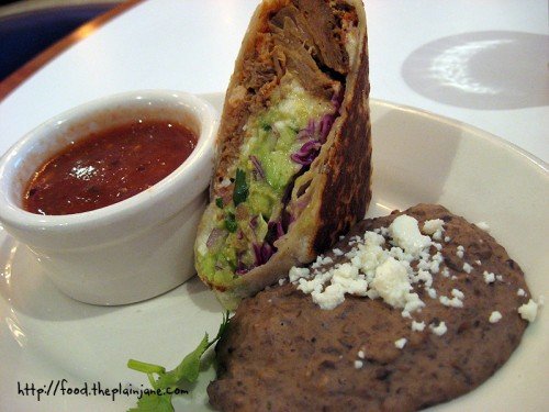 Course 3 was a sampling of their La Bamba Burrito – spiced chicken carnitas along with guacamole, queso fresco, pico de gallo and cabbage wrapped up in a crispy warm tortilla. Again, Jake really liked this (he liked all of the courses to save you the suspense) but for some reason I didn’t dig it as much. I think I didn’t like it because it wasn’t all smooshed together like a regular burrito and I wasn’t into the chicken carnitas – they tasted a little dry to me, but Jake didn’t think so. I did really like the side with this one – the refried black beans – and I don’t like beans. The refried black beans had a really nice, home made flavor and were creamy. The overall flavor I just dug a whole lot and it didn’t taste “beany” to me – I don’t know if that makes sense or not – but it just tasted like a creamy, delicious side dish with a lot of flavor.