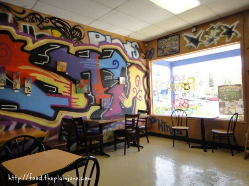 The whole inside of the deli has got this counter culture vibe to it, from the spray-painted and tagged up walls, to the guitar picks that are glued to the floor (I should have taken of photo of that).