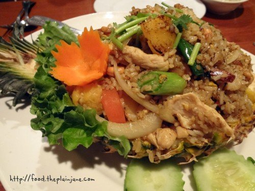 [Pineapple Fried Rice – fried rice with a combination of chicken, shrimp, pineapple, cashew nuts, onion, scallion, egg, and spice with curry powder, served in a pineapple shell – $13.95]