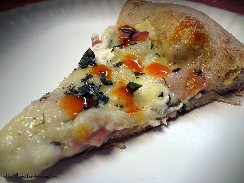 This one is done on a whole wheat crust, with smoked black forest ham. We didn’t have any bacon, otherwise I would have used that.