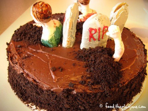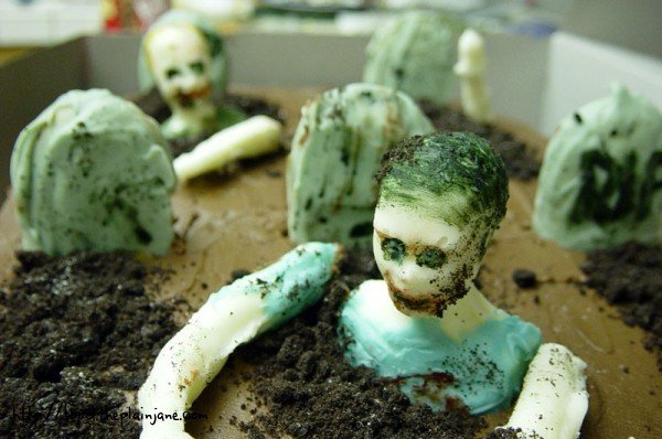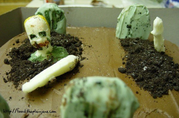 The zombies are just stuffed right into the cake with “fresh dirt” piled around them to hide any cake crumbs. The “fresh dirt” is crushed Oreo cookies.