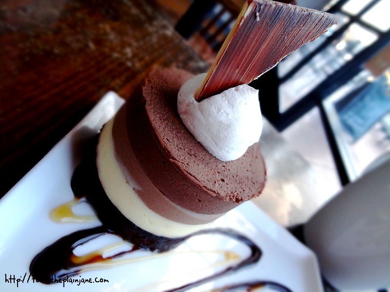 It has three layers of chocolate: dark chocolate mousse on top, followed by milk chocolate and white chocolate before getting to the chocolate cake base.