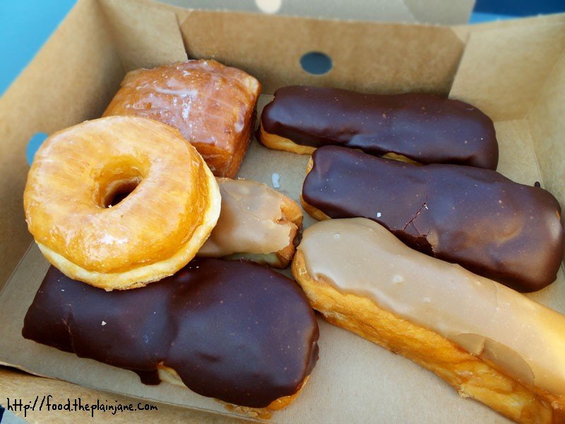 Our haul: three creme filled chocolate bars, one filled maple bar (because they only had one left), a regular maple bar, a raised glazed (I can rhyme!) and … I forgot what that thing in the top left corner is. I mean, obviously it’s some square donut but I can’t remember what the heck it is… Ah well, no matter.
