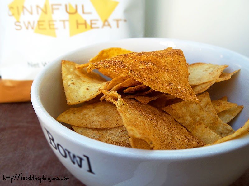 Let’s start with maybe the most unusual flavor of the bunch: the Cinnful Sweet Heat. These are tortilla chips dusted with cane sugar, cinnamon and cayenne (and probably other spices). The sweetness of the chips is not too overpowering and the kick of the cayenne helps offset the sweetness of the chips. The spiciness is what makes these not “too weird” since the balance of sweet and spicy is pretty spot on. I could imagine pairing this with a sweet/spicy salsa, or crunched on top of desserts. Or maybe crunched up and used in a batter for something pan fried (french toast, chicken??). Surprisingly good but also not something I want to just munch on alone, I’d rather use this in another recipe.