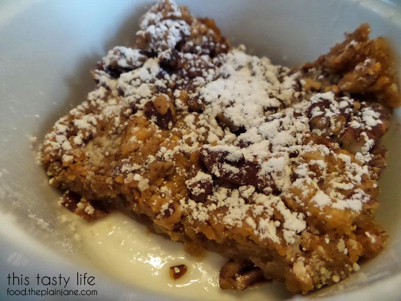 I forgot the kids don’t really like fruit all that much (what) and decided to spring for the peach cobbler. It was homemade and they gave an okay sized portion for five bucks. It has pecans in it, too, and kinda of looked like a dried fruit bar. The fruit is simmered in brandy and it has a pecan crumble on top. I liked the crumble part but wasn’t too into the flavor of the peaches with the brandy. Maybe if it had been a different fruit I’d have been more into it, but I thought it was just okay.