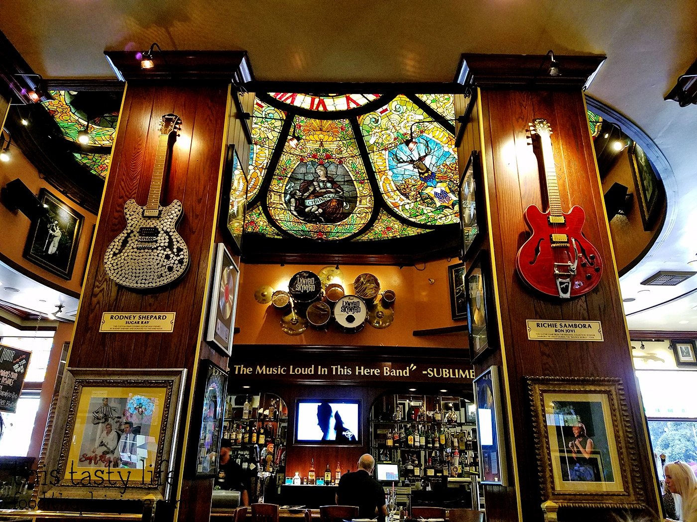 There were lots of cool rock memorabilia gracing the walls. There was also pretty stained glass windows that were kept in tack from the previous location. I like how they kept the stained glass which partially acts as a skylight above the bar.