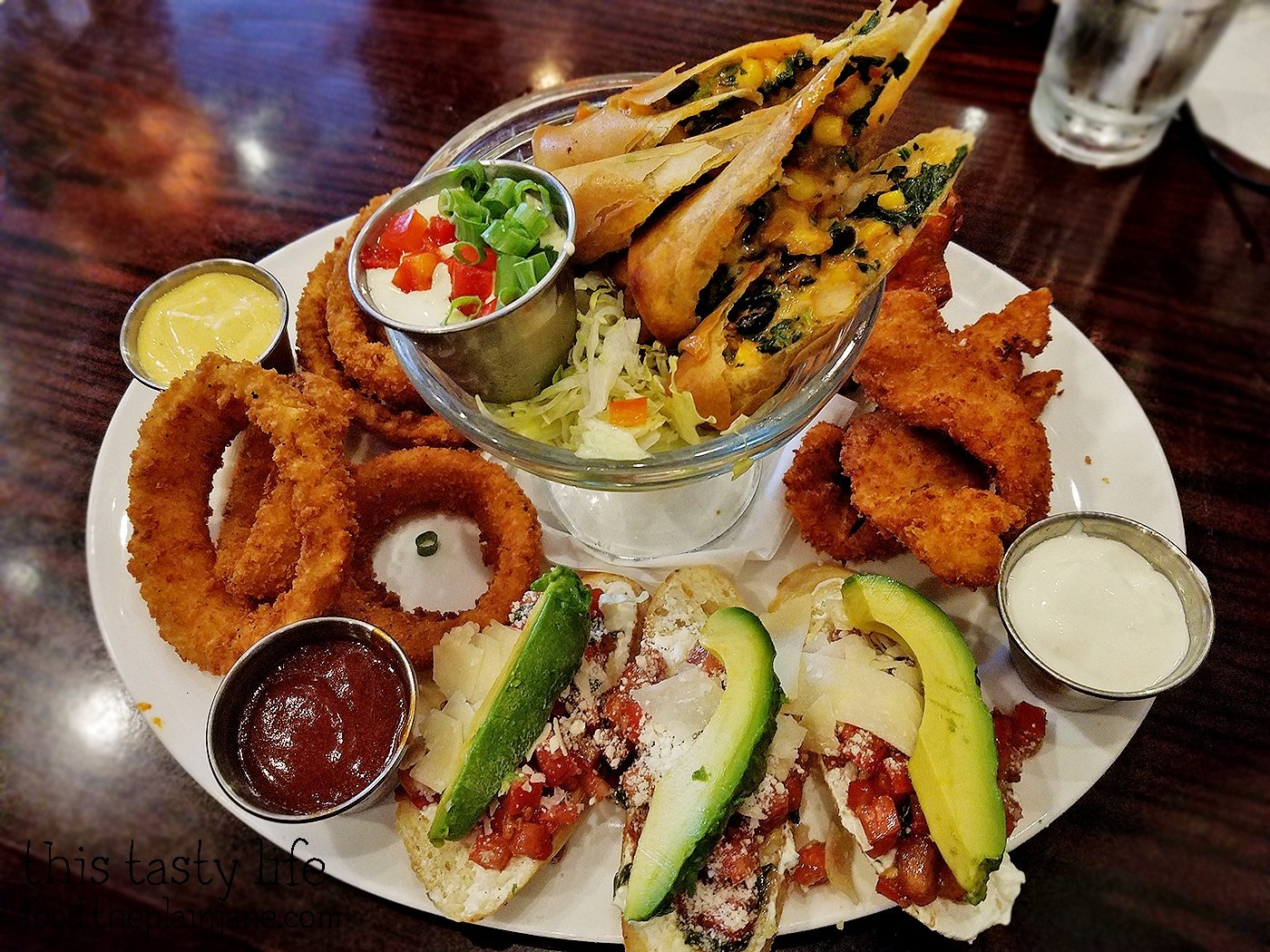 The Jumbo Combo is really true to it’s name. It’s a massive appetizer platter that has a little bit of everything that Hard Rock Cafe has to offer: onion rings, southwest spring rolls, buffalo wings (hidden on the other side), chicken tenders, and bruschetta (with avocado, which I asked for).