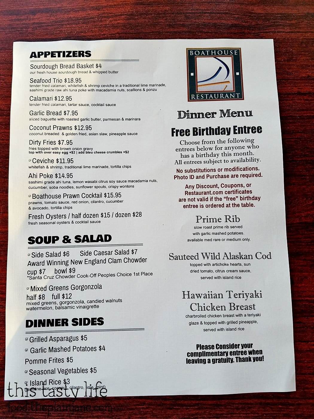 On the last Thursday of each month, the Boathouse Restaurant offers a free meal if you have a birthday that month. They have changed it slightly and now offer three different meals as the free birthday meal. You have your choice of prime rib, Alaskan cod, or teriyaki chicken breast.