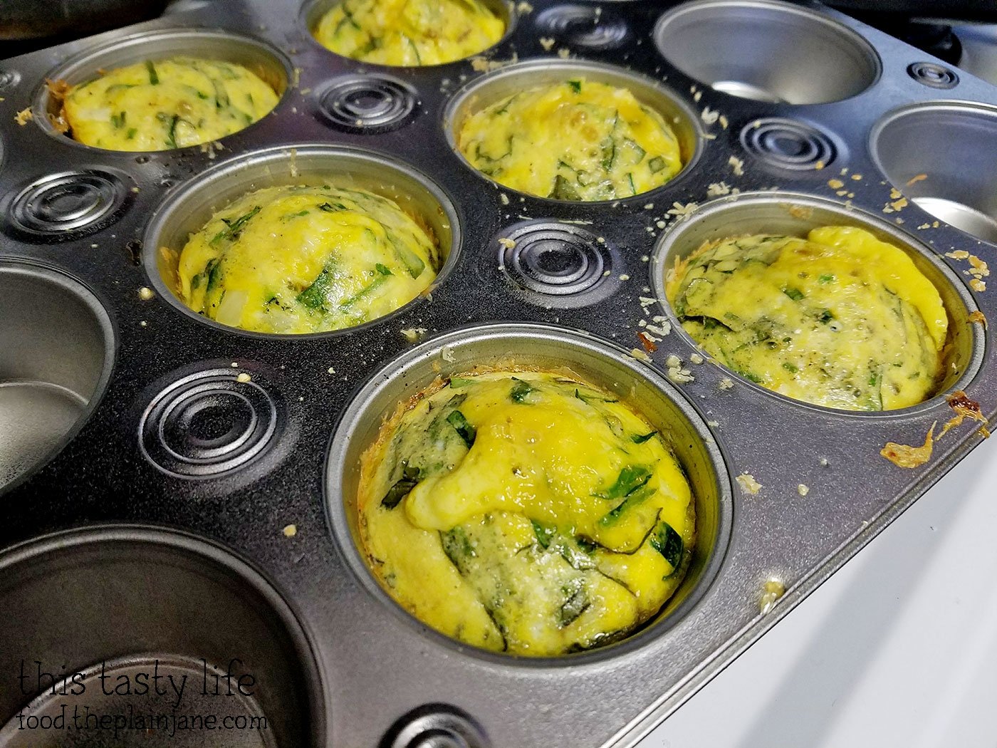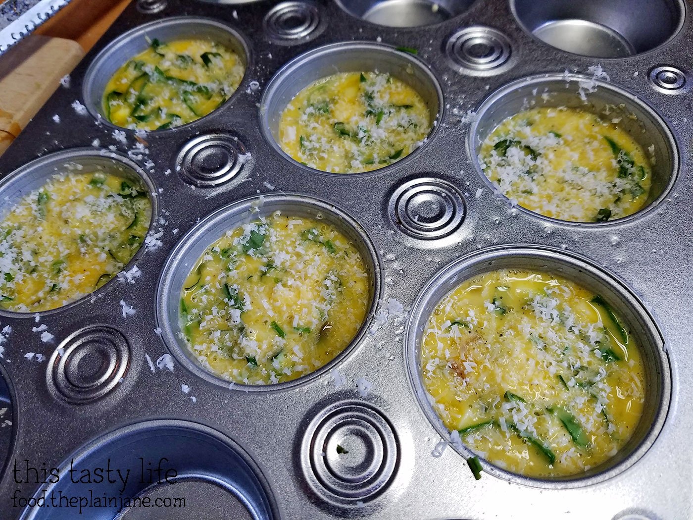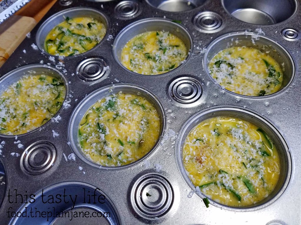 Beat eggs and water together and evenly divide in a muffin pan.