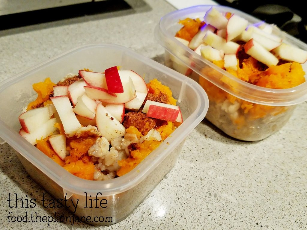 Cut up one apple into slices (make sure to cut out the core). Split oatmeal into 4 containers. Add 1/4 roasted sweet potato, apples, and a split amount of cinnamon, cloves, and nutmeg.
