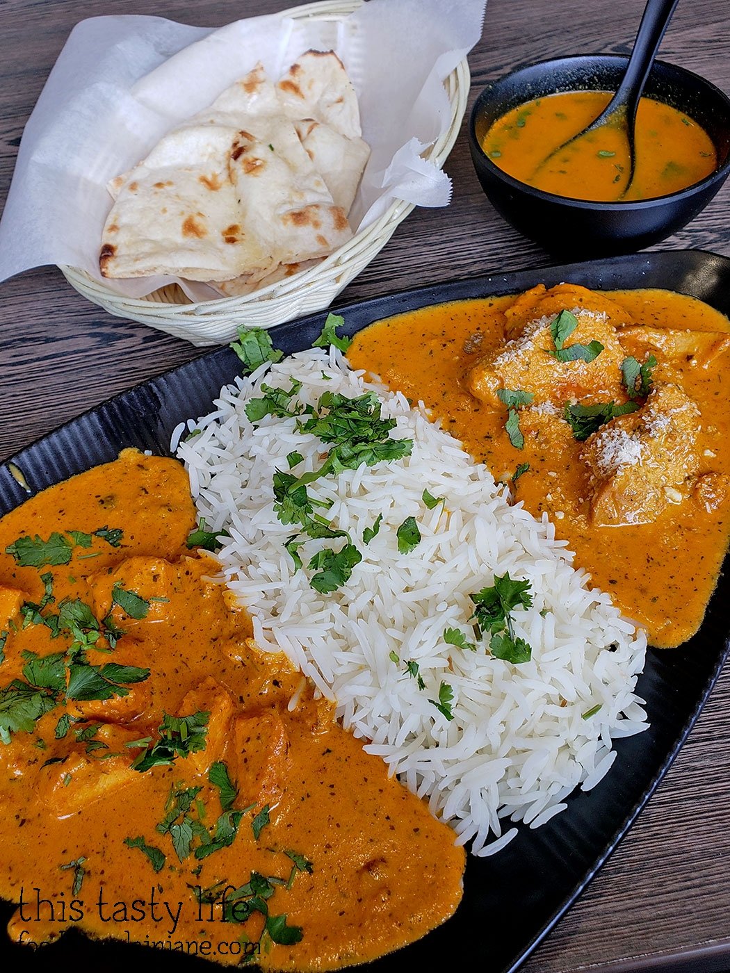 Tikka Masala is a curry based in a creamy onion and tomato sauce. It has a robust flavor and very slight sweetness. The chicken was white meat and a few pieces were on the drier side, but overall it was good.