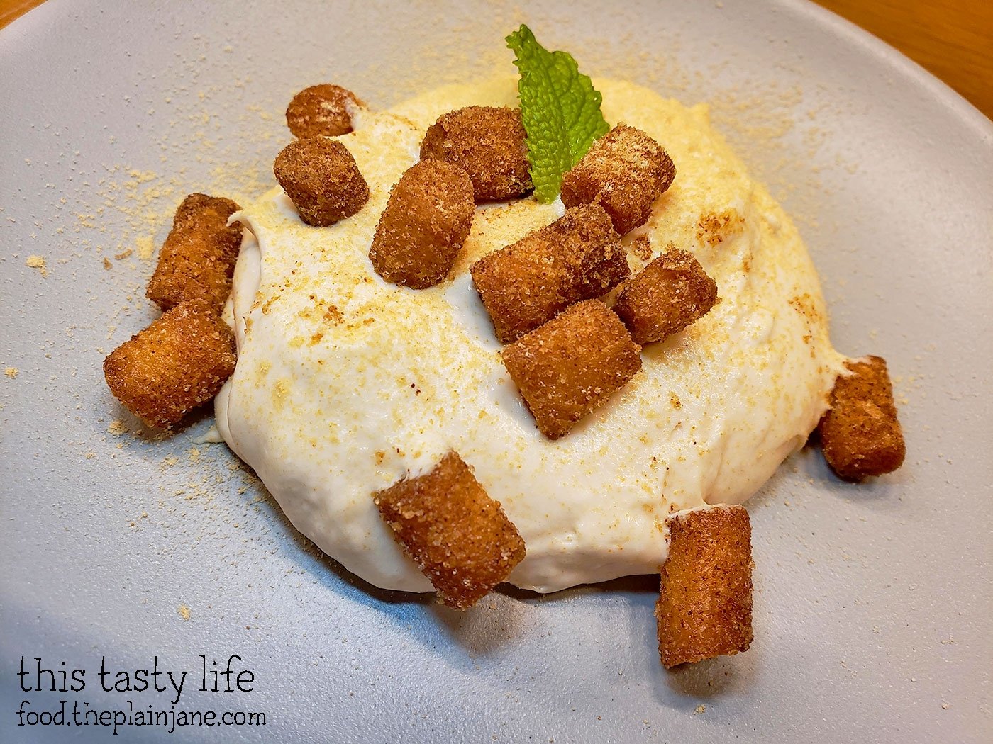 Injeolmi is a Korean rice cake covered with powdered dried beans. In this case, the rice cake has been fried and then covered with the dried beans and placed on top of the tiramisu. The tiramisu doesn’t taste like the traditional espresso tiramisu with lady fingers – this version tasted more like a light, fluffy cheesecake filling! AND I LOVED IT! There’s a light sweetness to it and it’s really creamy, much like a mousse. The fried rice cakes vary in texture. Some of them were slightly chewy, reminding you that they’re rice cakes, while others were completely crunchy. I liked that the texture varied since it gave more contrast to the dessert.