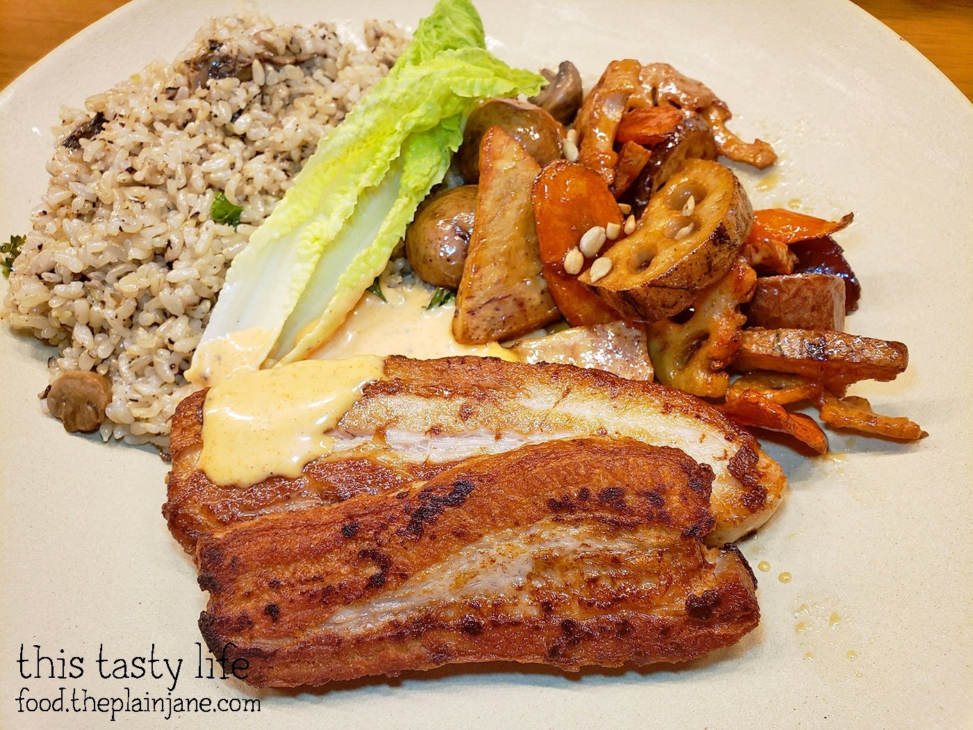 For my plate, I choose the Crispy Pork Belly with mushroom rice and grilled root vegetables.