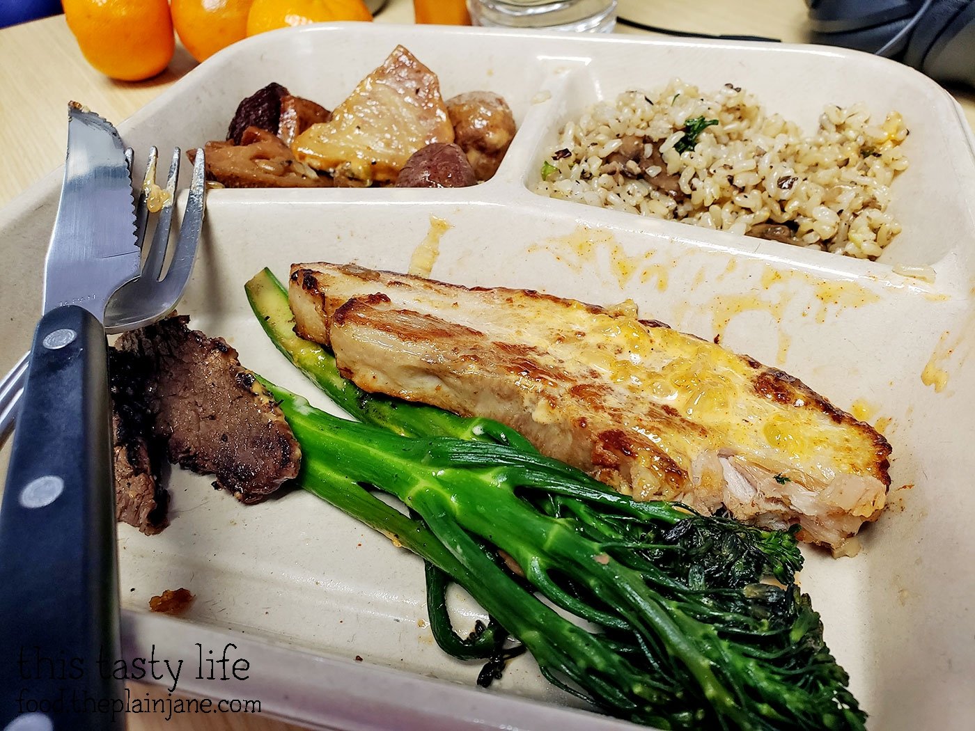 We each got to choose our own entree. Jake chose the Beef Bulgogi Plate with Perilla Multi-grains and Grilled Broccolini. Jake adored the bulgogi. The seasoning on it was just right and the beef was incredibly tender and juicy. We didn’t care for the perilla multi-grains – not sure what exactly was in the mix but it looked like a big mix of grains. The flavor was a bit bland on them.