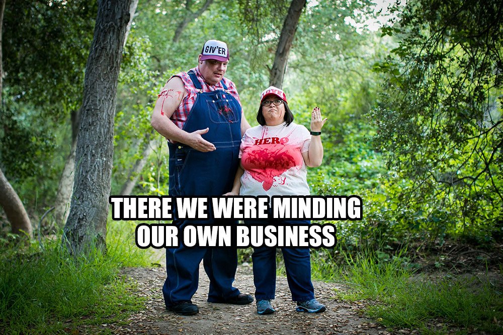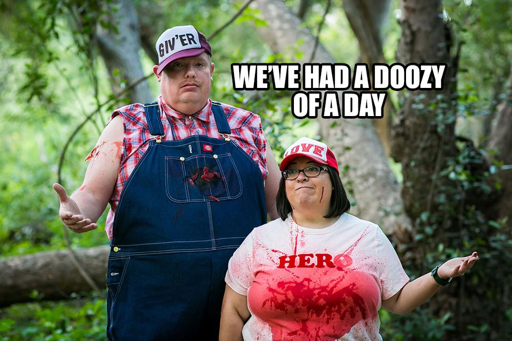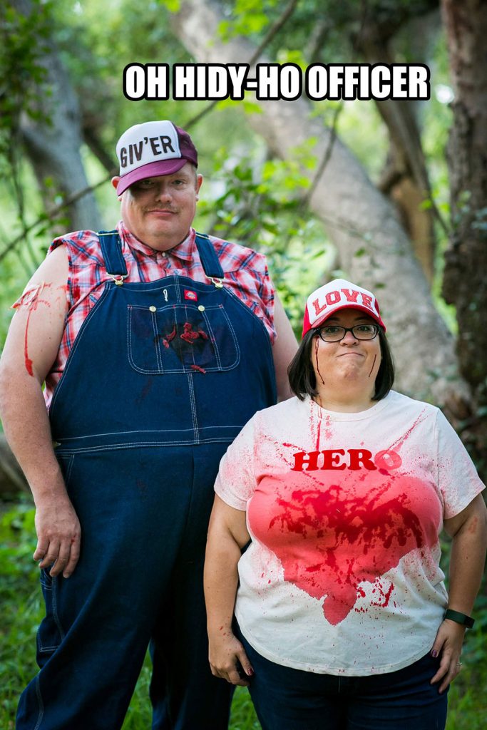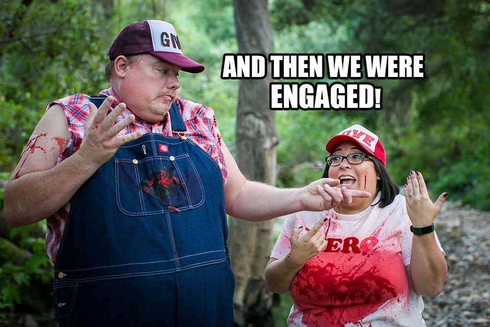 A bloody hillbilly engagement shoot! Jake is supposed to be Dale and he’s pretty spot on. I’m supposed to be Tucker but I didn’t want to wear suspenders. I thought the “hero” shirt would be a nice touch along with my “Love” trucker hat.