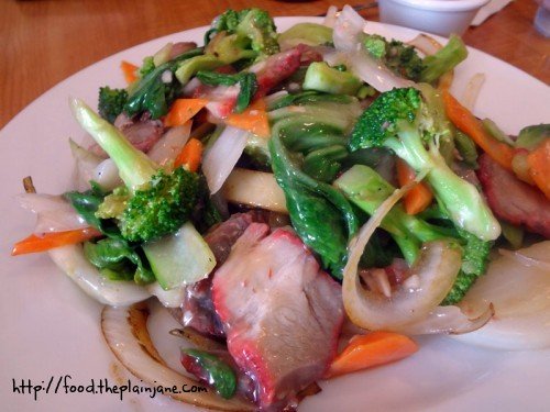 [stir-fried noodles with cha-siu pork, baby bok choy, broccoli, carrots, celery and onions in a garlic sauce – $7.75]