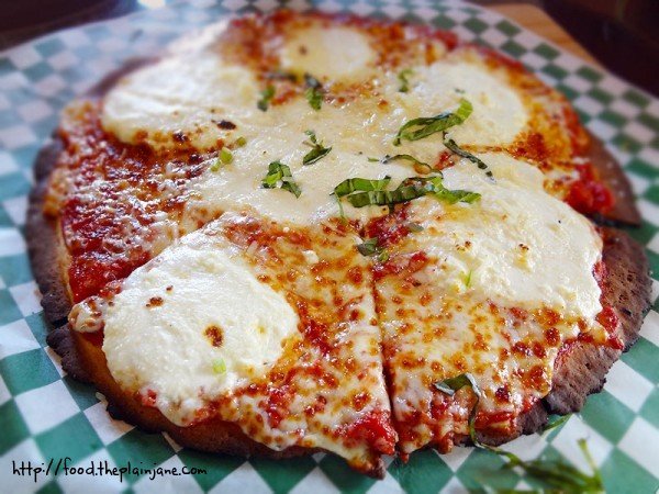This also had tomato sauce, mozzarella and just a touch of basil. I would have enjoyed a wee more bit of basil, but it was fine. The crust was a gluten free crust that was quite thin (like NY style thin) and quite a bit chewy. The outer edges of the pizza were kind of burnt which I did not like since it made the other edge too hard to eat. But overall the crust wasn’t bad – you could tell this wasn’t a normal crust, but it didn’t deter too much from the pizza (except for the burnt edges). Overall good flavor and good distribution of cheese.