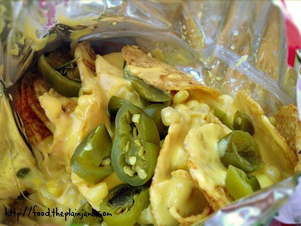 I ate my words shortly after though since I did actually kind of like it. These are served right inside of a bag of salsa flavored Tostitos chips and topped off with nacho cheese, jalapenos and corn. Nacho cheese and corn?! Was this invented on purpose? I can’t see how that’s possible. I honestly believe someone had an open can of corn that got accidentally dumped in some nacho cheese and no one noticed until they started eating it and then decided it was good. I would never put “nacho cheese” and “corn” together otherwise. But for some reason it’s tasty? Even as I ate it I was in disbelief. Still kinda am.