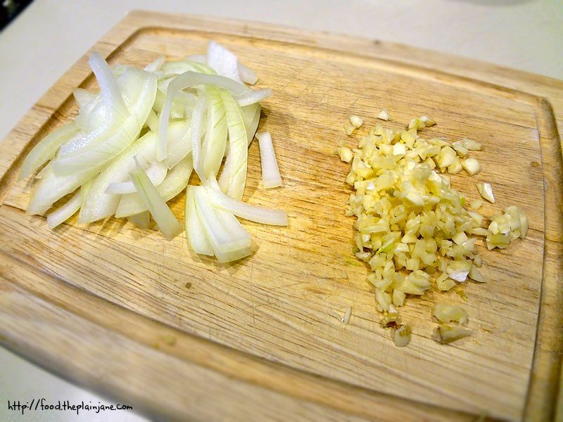 Chop up about half an onion and five cloves of garlic. It seems like a lot of garlic but I think it gives the bean sauce a great, simple flavor.