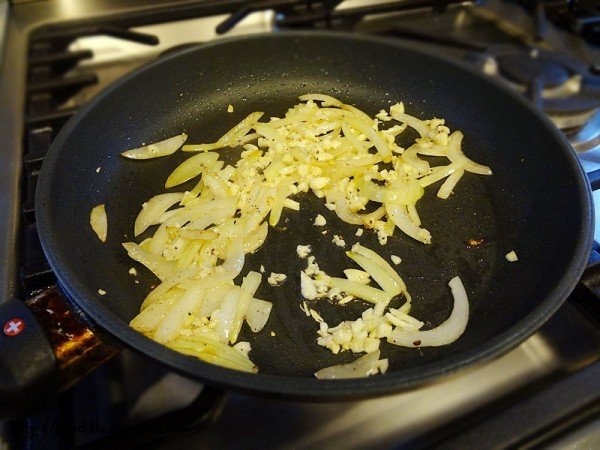 Cook the onions in olive oil with a sprinkle of salt and pepper until soft and translucent. Add the garlic and cook for another minute, until fragrant.