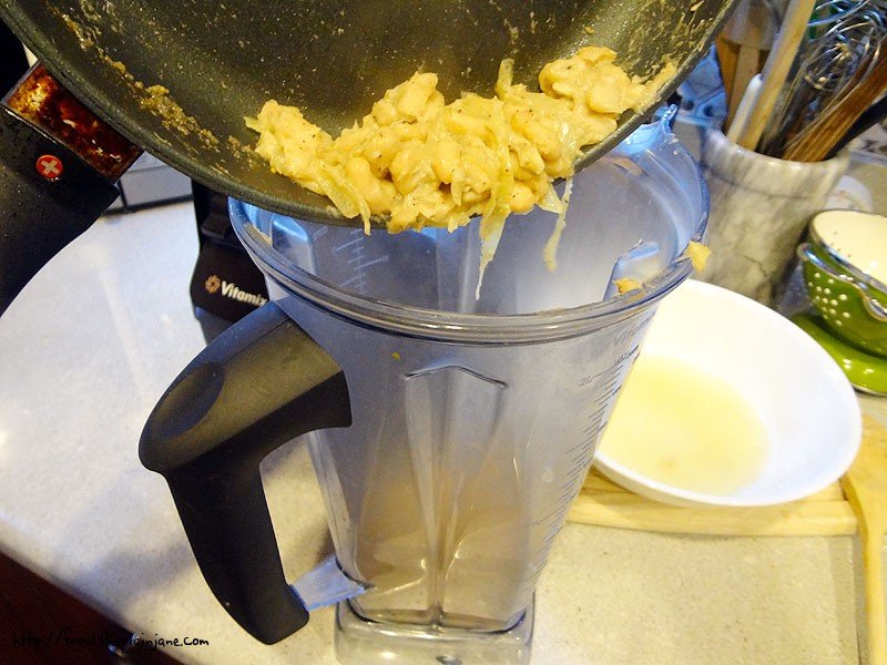 Put the whole thing into your blender with the rest of the reserved bean liquid and a few good tablespoons of olive oil.