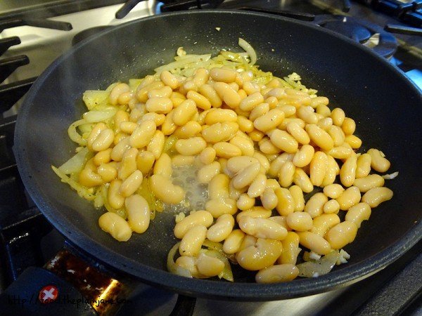 Add your beans and a few tablespoons of the reserved bean liquid. Add another dash of salt and pepper and cook until heated through.