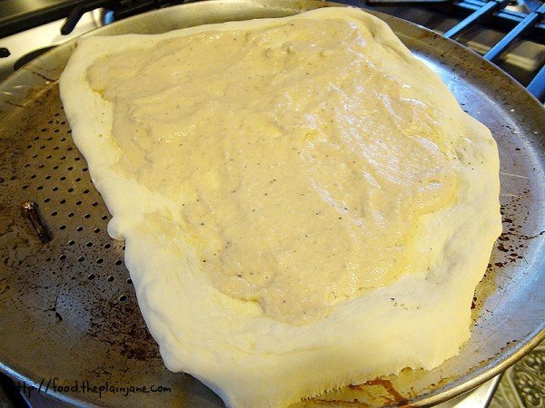 The dough is ready for that beautiful white bean sauce to be spooned on top of the crust.