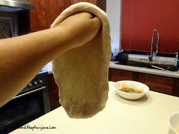 I like to let gravity do all of the work for me. I start to twist the dough around in the air to stretch it out. I don’t do that tossing thing – I’m afraid of dropping the whole thing on the floor. I work quickly enough to get the dough out to a good size – though not quite round… but that’s okay!