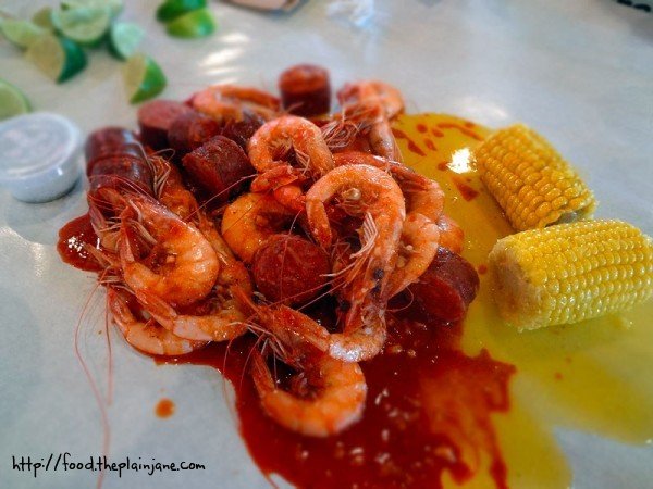 We ended up sharing 1 pound of shrimp ($10 per pound), a half pound of sausages ($8 per pound) and 2 corn on the cob ($.75 cents each).