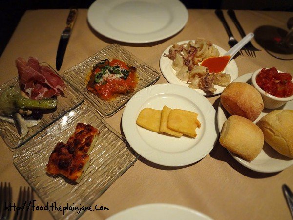 This was the appetizer samplers laid out before Stacey and I for our first course. No messing around here. There’s a little bit of everything, including some complimentary bread with a bruschetta topping (which was incredibly flavorful for something that just looked like tomatoes in a cup).