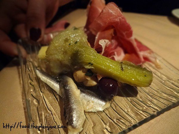 [pickled veggies plate with artichoke, olives, mushrooms, sardines, cheese and prosciutto]