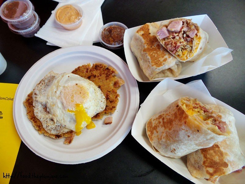 The ham and egg burrito is calling my name man! The ham cake sounded promising, but was a bit misleading. Great find!