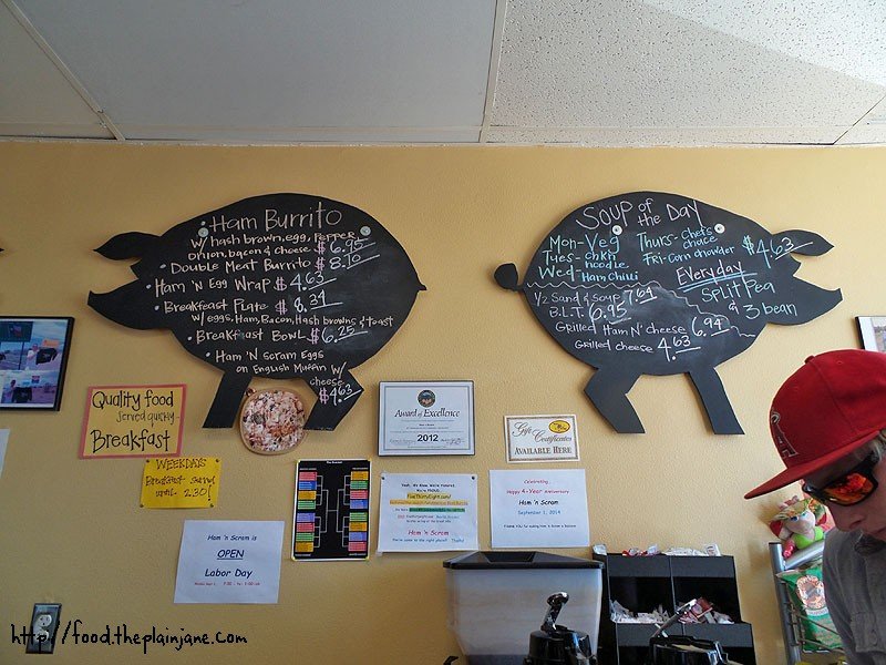 Breakfast and lunch are both covered here at the Ham n Scram. Jake, who is secretly my own investigative reporter, talked a bit to the owner while we waited for our food. He was from Detroit and grew up eating delicious, fine crafted ham (my words, not his) and when he came out to Southern California he discovered that well… there were no places really doing ham. He said Honeybaked Ham was maybe the closest to the “real thing” and he decided to open up his own place to make smoked ham. They make all the ham there at the shop.