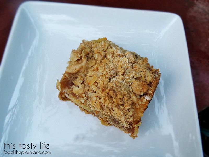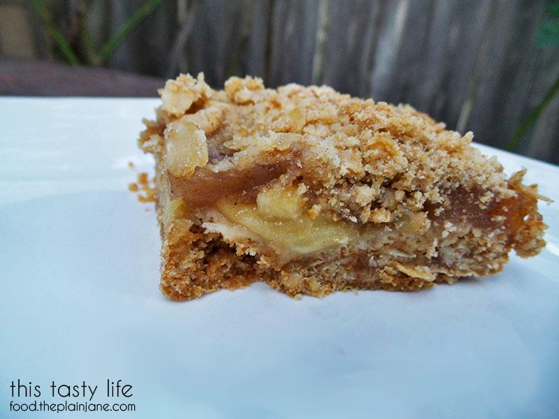 I used this recipe from The Comfort of Cooking to make the bars. The only difference is I used pumpkin pie spice for the seasoning instead of just cinnamon and nutmeg. I love the flavor of cloves and the other stuff in pumpkin pie spice. I think I’d use less oatmeal next time though, or pulse and process the oats down a little before using them. The texture of the oats was just “okay”, I thought the pieces were a little too big. But otherwise, it tasted just like apple pie!