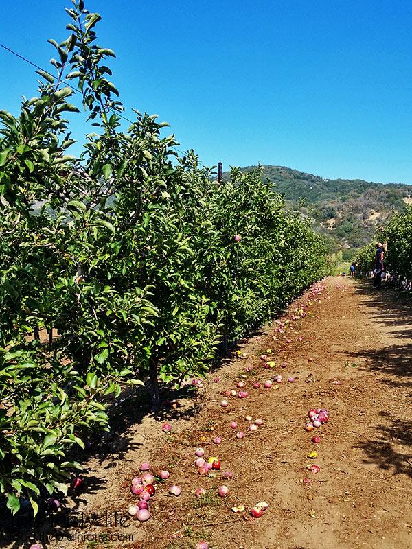 Volcan Valley Apple Farm is right next to the wineries in Julian. When you go up Julian Orchards Dr., there will be many, many cars and tons of people and it’ll feel way too crowded. DRIVE PAST ALL THAT. There’s a place to turn left further down with a larger dirt area to park in and a quieter entrance to go through so you don’t have to suffer through the madness and think you won’t be able to park. There’s plenty of spaces to park over there! There’s an entrance where you can purchase a bag and the nice lady will tell you what apples are left. Bags are $10 each.