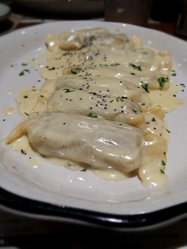 Here’s a peek at the inside of this fluffy pillows of goodness. The inside was so creamy and smooth and I loved the overall flavor of the dish. The truffle cream sauce has the right amount of truffle to scent and flavor it without being totally overwhelming. BUT… this dish is so so so RICH. I only managed to eat three of the little pockets and I loved them but I could not eat any more of it after that. I almost wished I could just have two of them with a side of chicken or something to break up the richness of the dish.