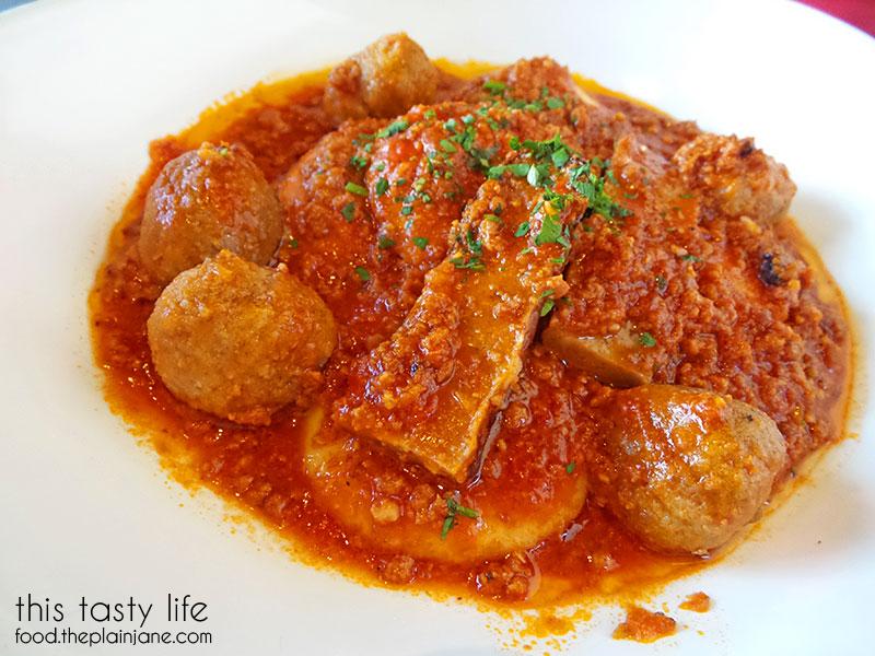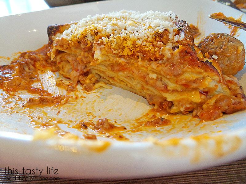 Jake surprised me by ordereing the Gnocchi Ripieni. These large gnocchi (which looked more like puffy round smooth edged ravioli to me) are filled with gorgonzola cheese and Jake isn’t the biggest fan of blue type cheeses. He added on meatballs along with meat sauce because he’s a boy and he likes things extra, extra meaty (heehee). I took a bite of the creamy gnocchi and after one bite I said, “Whoa… that is really, really rich.” The gorgonzola filling was a bit pungent and borderline overpowering. Even eating it with the meat sauce and meatballs, the gorgonzola really does knock you over the head. The waiter did warn Jake beforehand about the blue cheese but he insisted on getting it. I definitely feel it’s a “to share” dish and gave Jake plenty of my lasagna to give his tastebuds a rest.