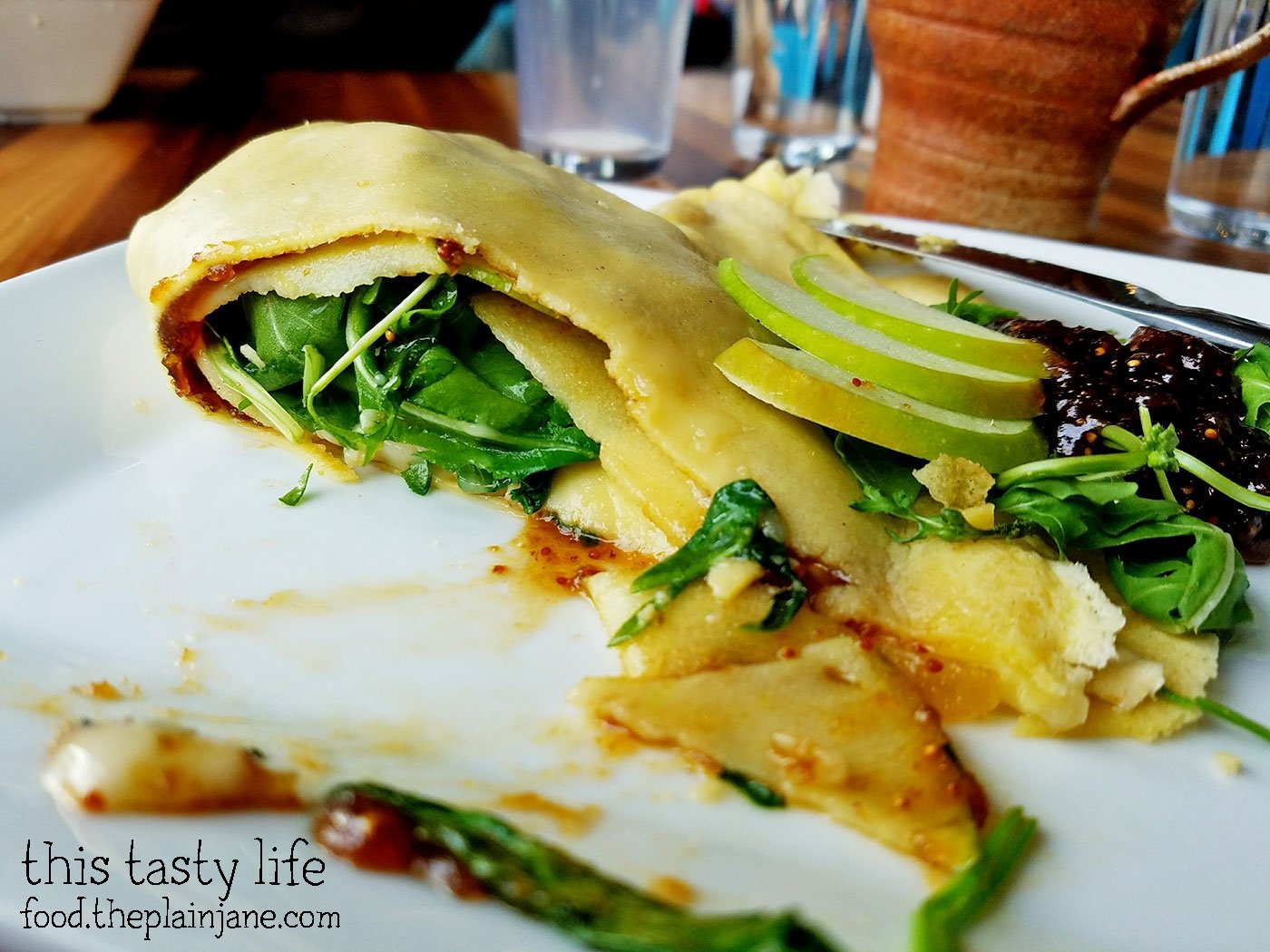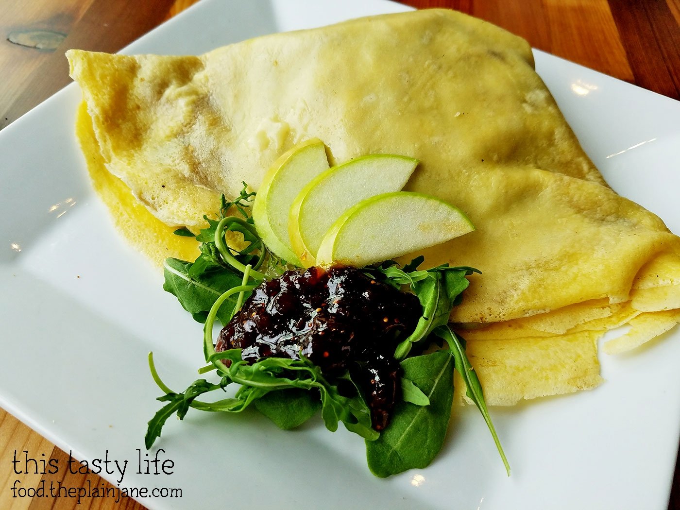 Jake brought the “wrong” crepe back up to the counter and within a couple of minutes I got the “right” crepe which was a Brie, Fig Jam, Apple + Arugula Crepe [$8].