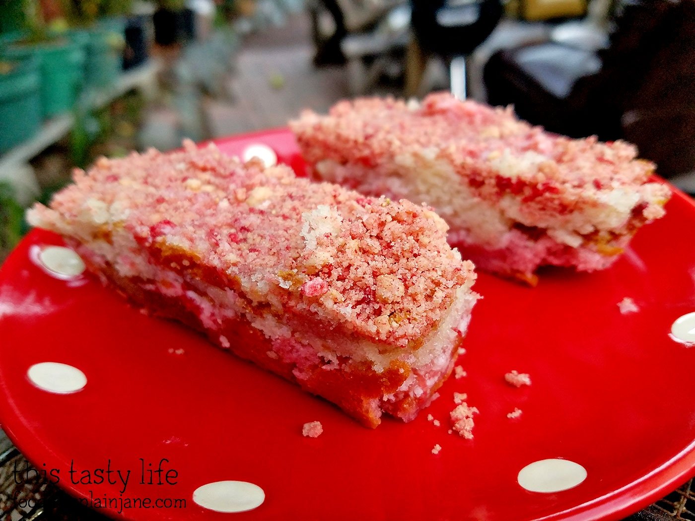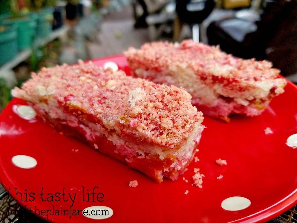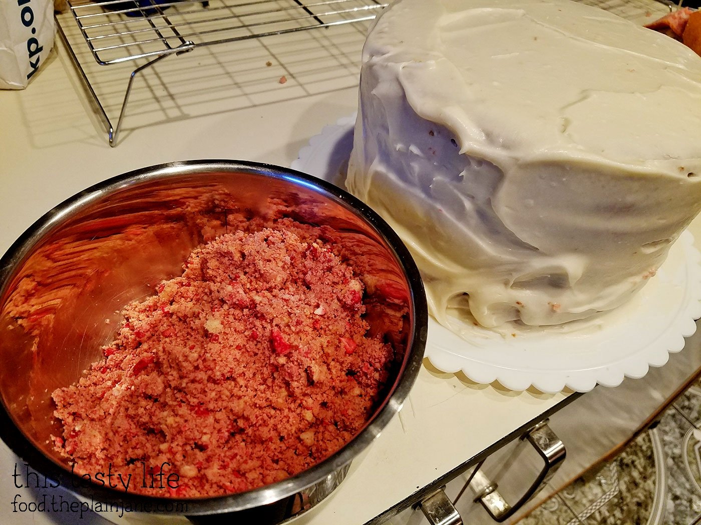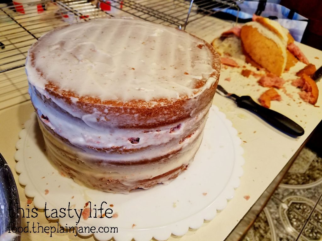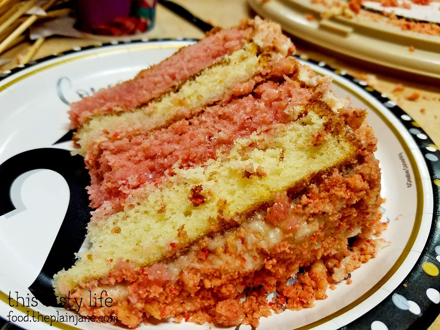 I used the leftover cake to make mini strawberry cake bars. I simply pressed the leftover pieces into my bar pan. Strawberry cake on the bottom, strawberry frosting in the middle, vanilla cake on top, plus the crunch topping.