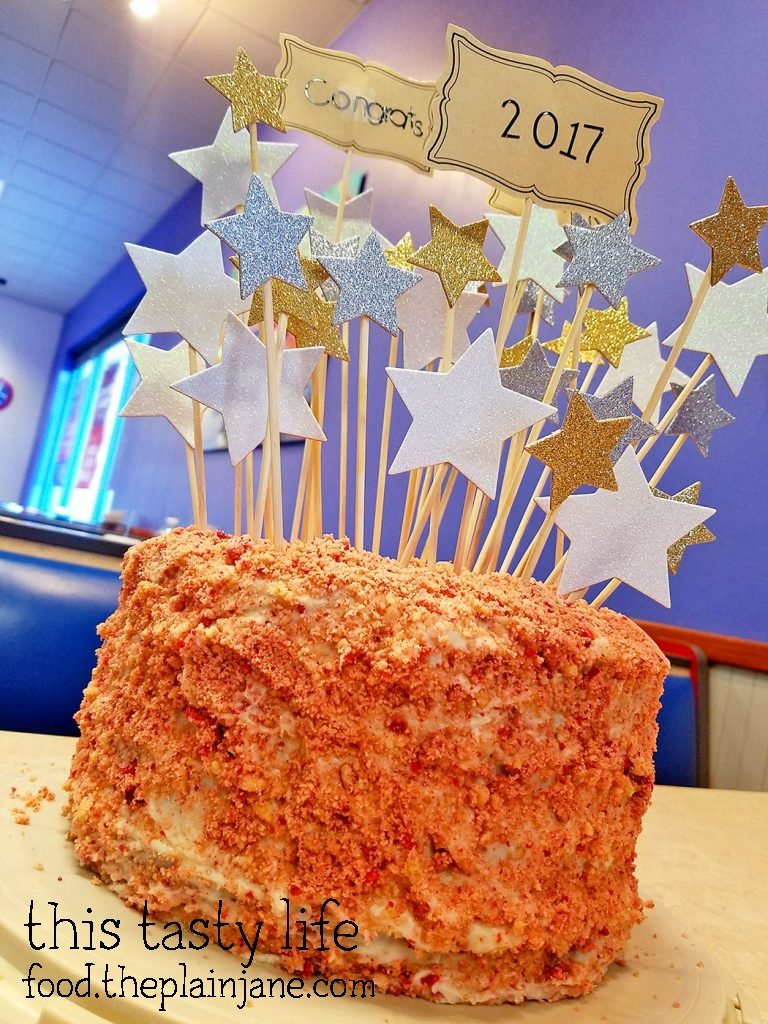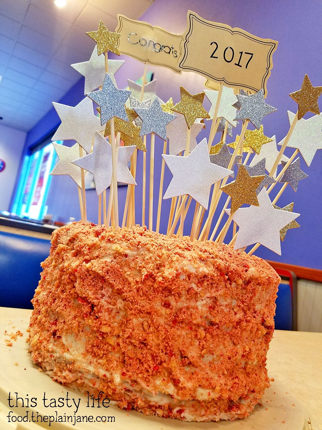 Here’s the cake with all of the decorations on top! I got the stars at Michael’s and attached them to wooden skewers. I cut some of the skewers to create different heights for the stars. The “Congrats” labels are made out of stickers.