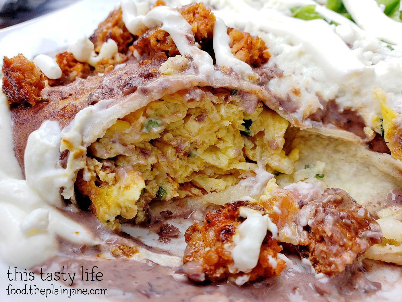 Here’s a look at the inside under all of the black bean sauce. It’s…. kind of like breakfast enchiladas, but covered with bean sauce instead of enchilada sauce. I have to also mention that the black bean sauce was INCREDIBLE. This is coming from a person who is NOT very keen on beans in general and I really loved the black bean sauce! It was velvety smooth and had a great overall flavor. They make this special black bean sauce for just this dish and it was really wonderful with the egg stuffed corn tortillas. The chorizo was also fabulous and really rounded out the whole plate. This was one of my favorite dishes at the Lazy Hippo – you don’t want to miss this one!