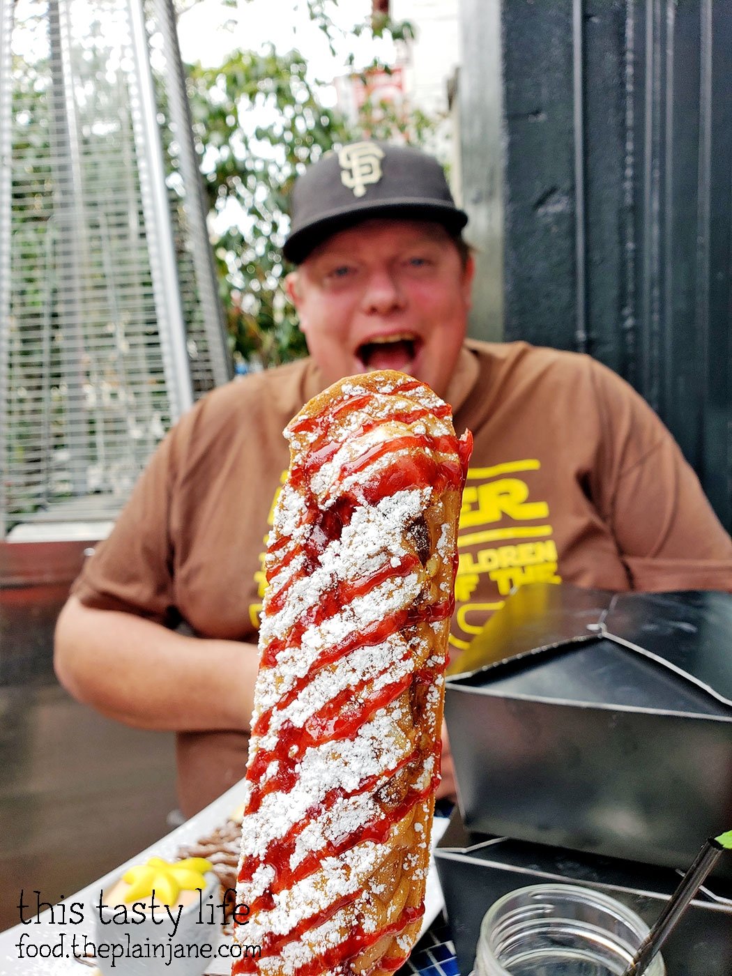 While I adored the presentation these colorful Crepes on a Stick, Jake and I found them to be on the dry side. Also they seemed more like waffles on a stick then crepes. Crepes are usually thin and soft and these were thick, crunchy, and hard. The nutella bacon one had chunks of bacon in it with the nutella drizzle on top. The lemon ricotta one had the best flavor but it still suffered from being too dry on the inside.