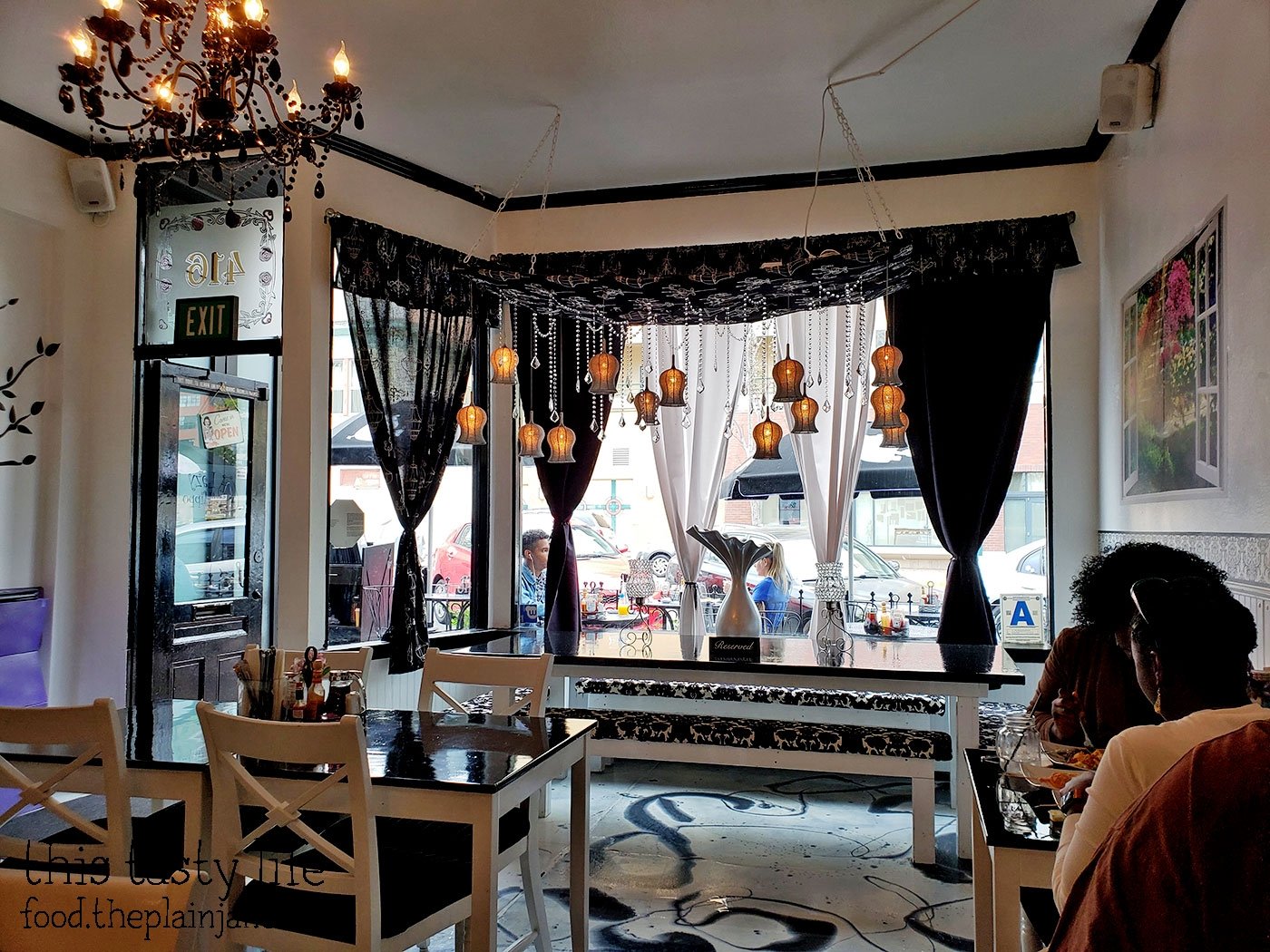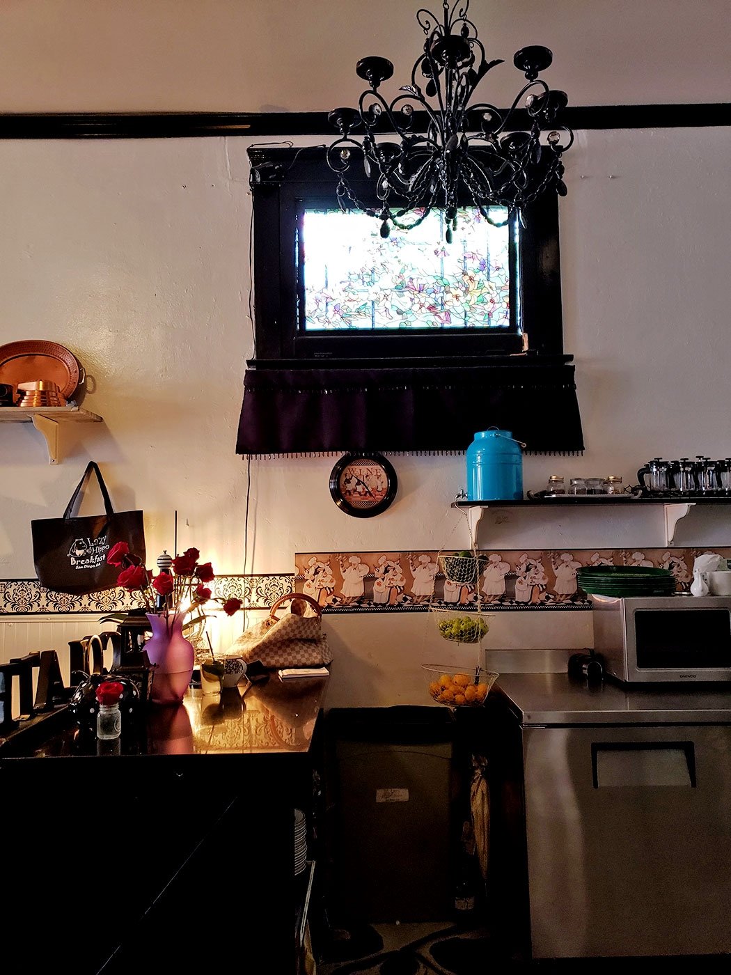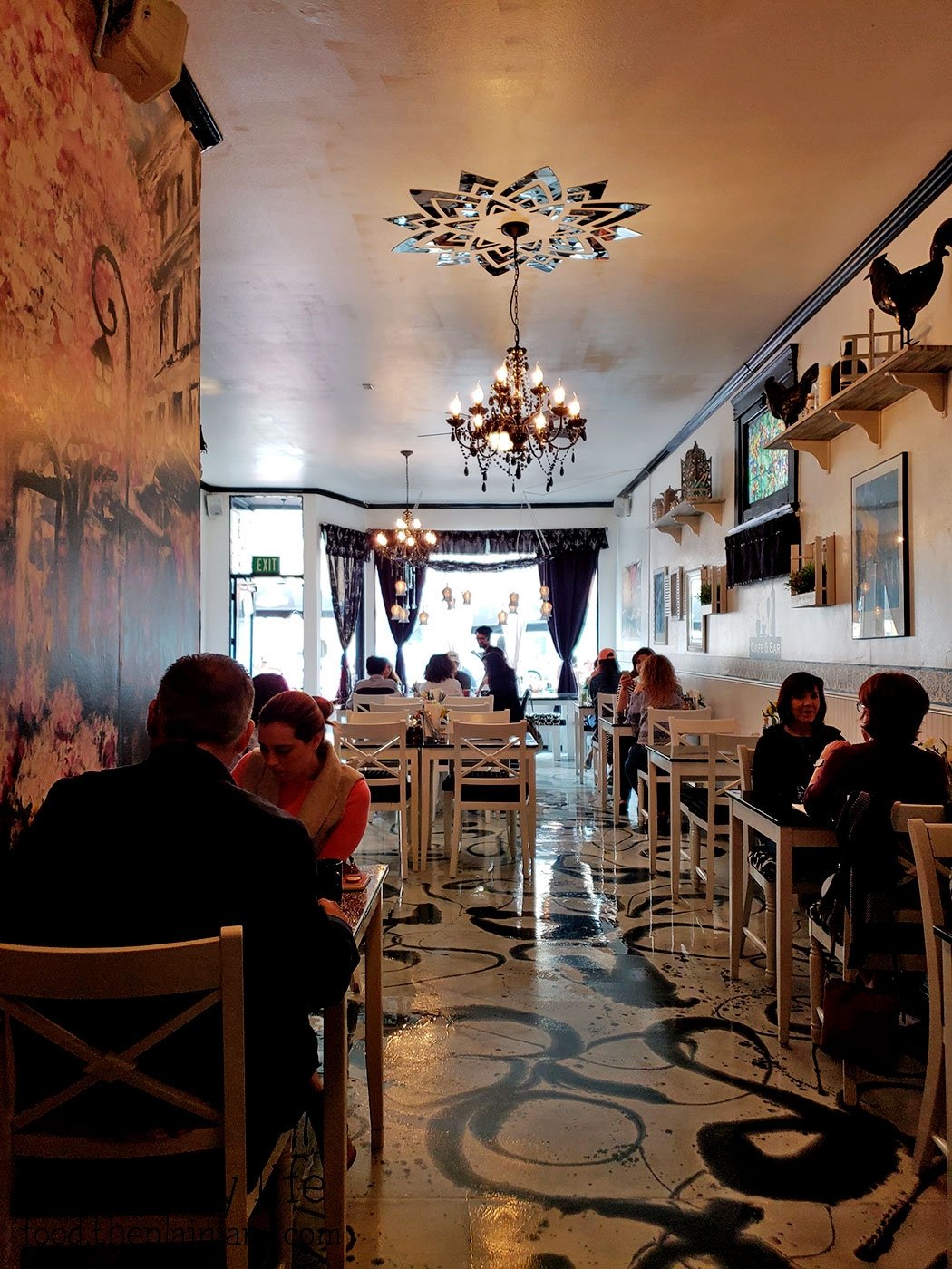The interior of the Lazy Hippo is quite eclectic! It’s got a bit of a chic vibe with these hanging lights and chandeliers.