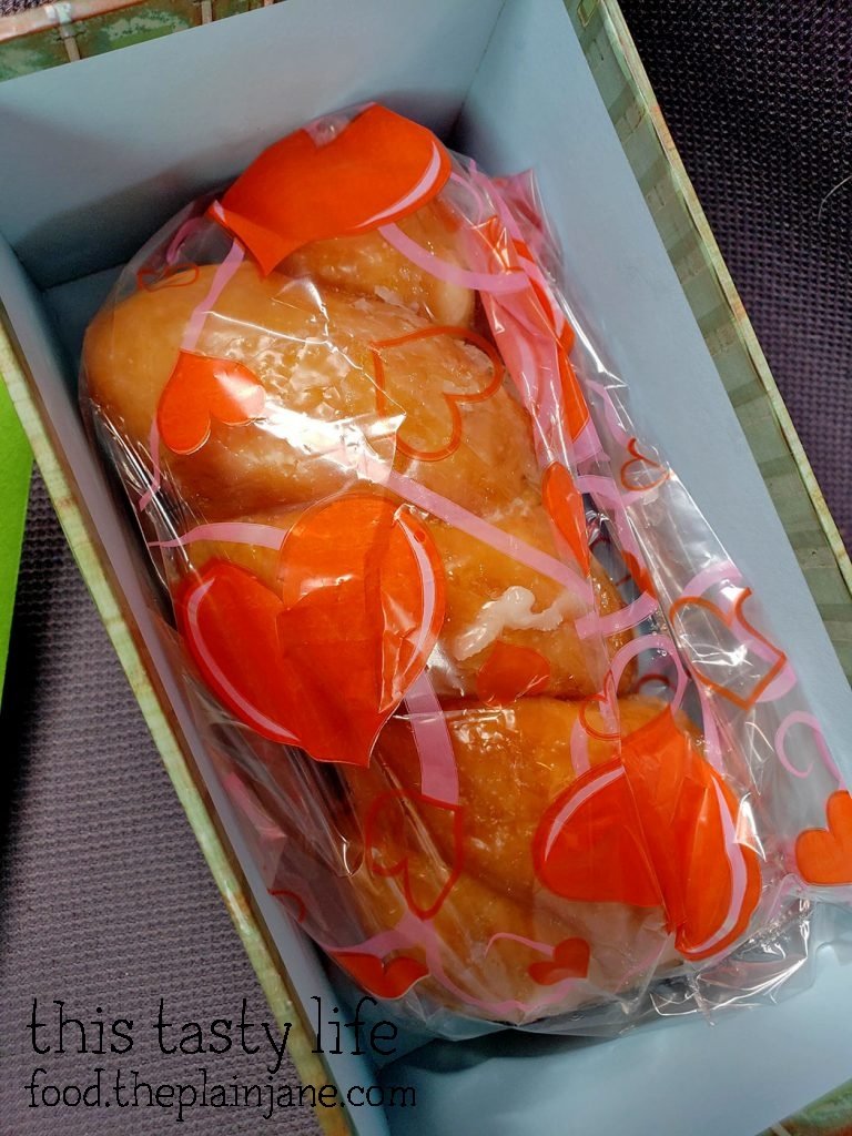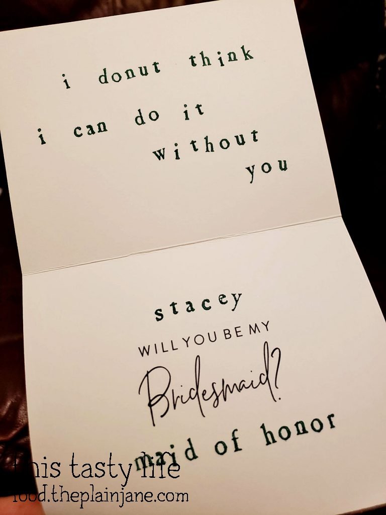 I purchased either twist or bar donuts for the proposal boxes since they fit the length of the box perfectly. I picked up the donuts at Donut Stop in Mira Mesa. They were all under $1. I put the donuts into a cellophane bag to protect them and gifted them to each of my bridesmaid. They all said yes!