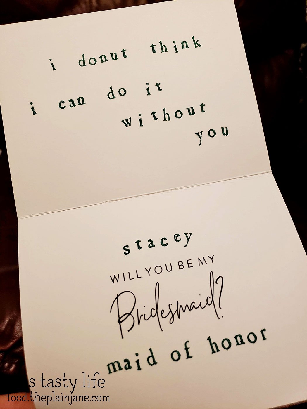 I added a couple of details to the inside of the card with some letter stamps. They actually make “Will you be my maid of honor?” cards but I didn’t think that far ahead and only bought “bridesmaid” ones, so two cards got the addition of “maid of honor” and “matron of honor” at the bottom!