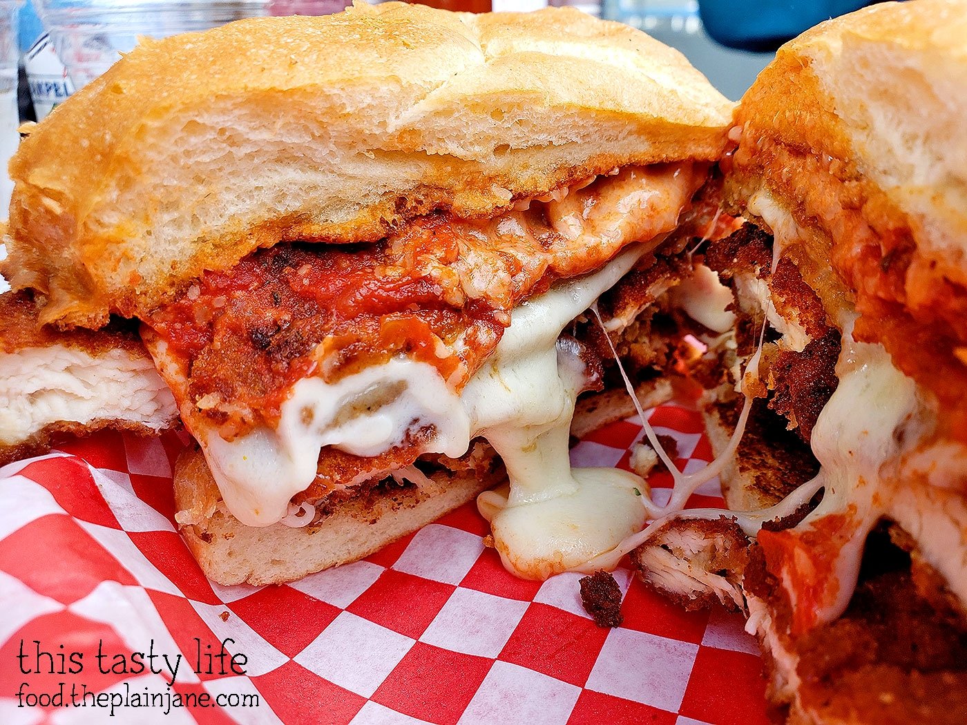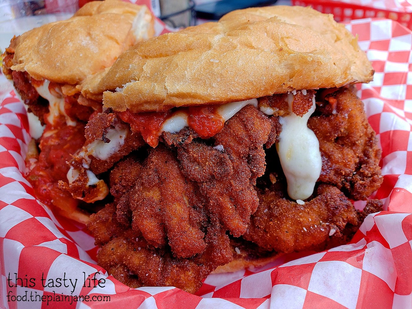 You can see the difference here with that waterfall of mozzarella oozing out of the sandwich. The chicken parm itself is really nicely done – it’s tender, crispy, and the marinara adds a ton of flavor along with that oozy mozzarella cheese! It’s also stacked HIGH so there’s a lot of chicken in this sandwich. Jake really loved it and enjoyed the flavors. It tasted very much like a chicken parm sandwich that you’d get on the east coast.