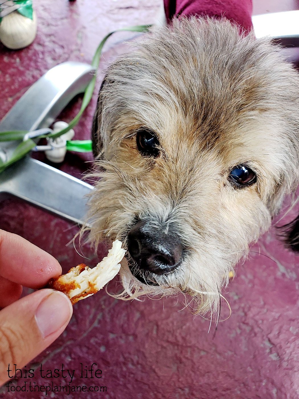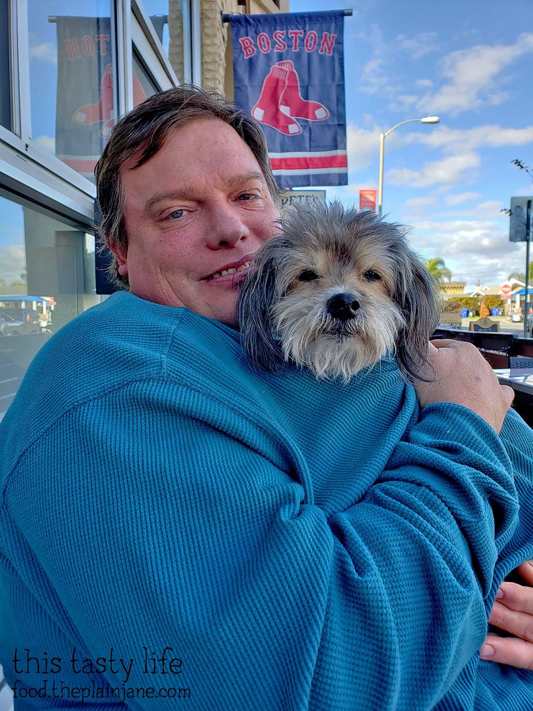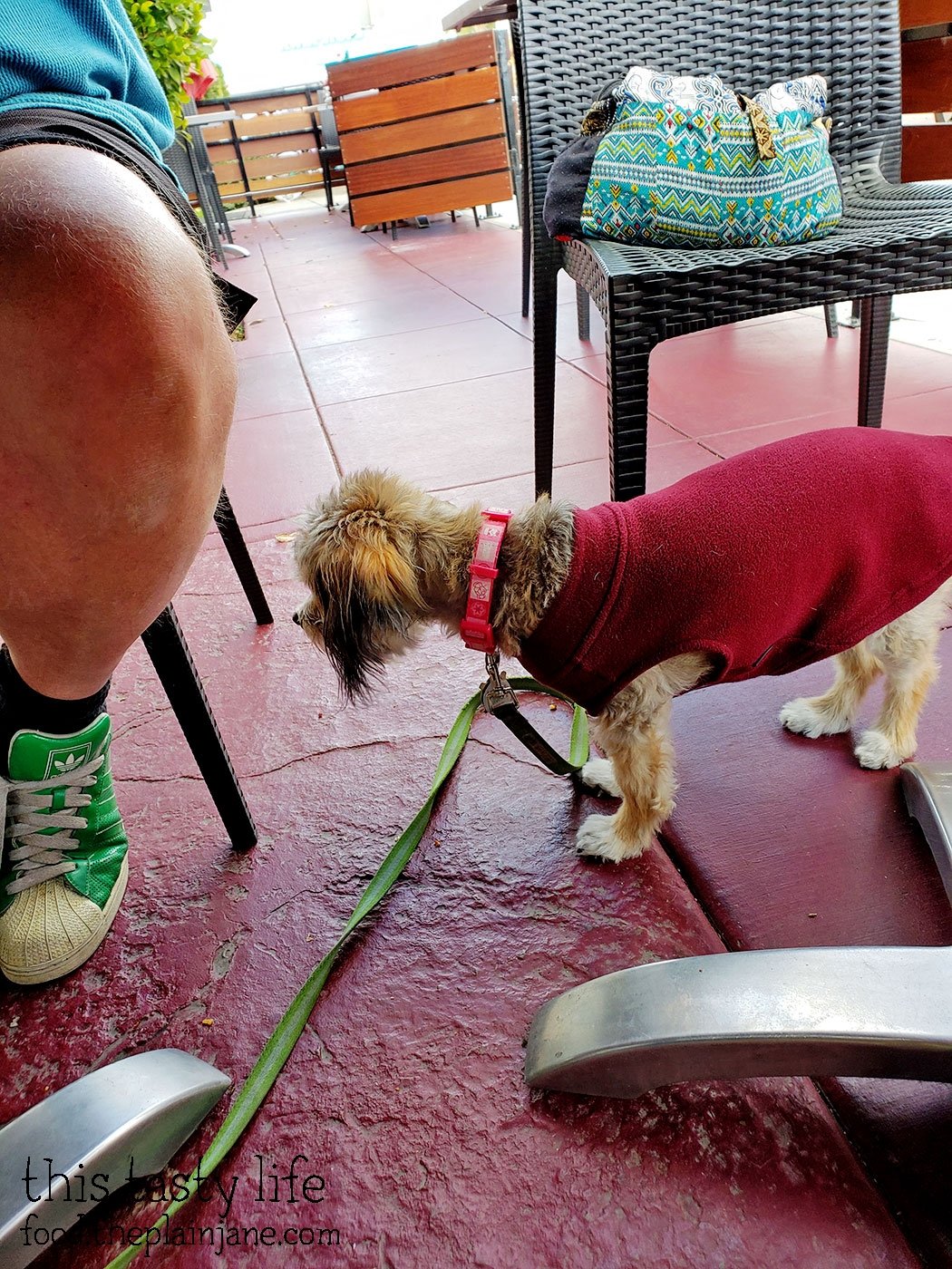 Maya was also with us! We sat outside on a coldish day, but there was a little bit of sun at least. Maya has a little doggie sweater on because I had to cut her fur in January and she was shivering all the time. Now she has a sweater to keep her warm!